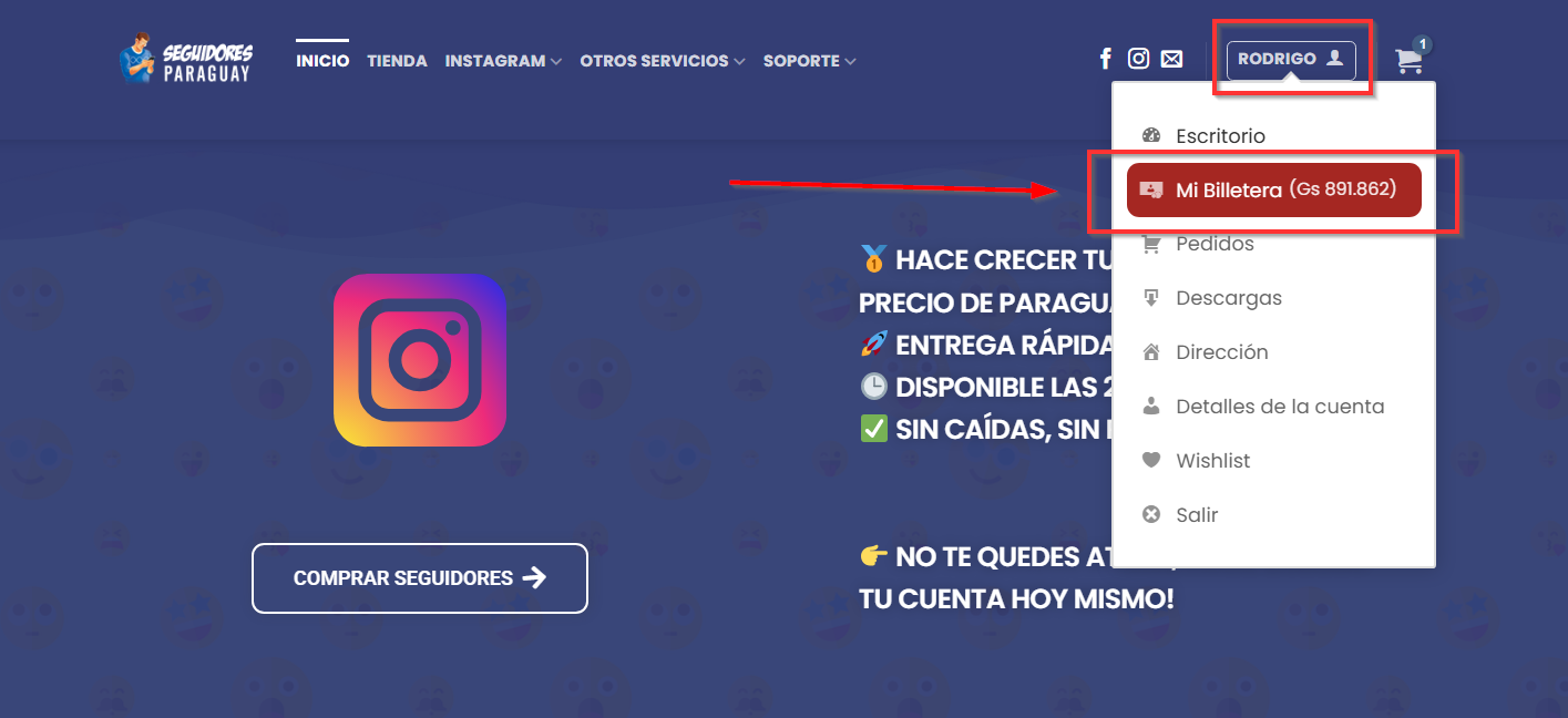 - El sistema te redireccionará automáticamente a Seguidores Paraguay y podrás ver tu saldo ya acreditado a tu cuenta.